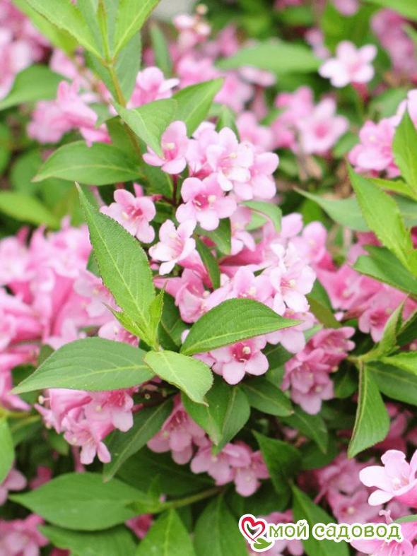 Вейгела Розеа (Weigela florida Rosea) — гибрид между вейгелой цветущей и вейгелой корейской. Раскидистый кустарник до 2м высотой и до 2,5м шириной. Цветки очень крупные с колосовидным отгибом, розовые, слегка пестрят белым, обильно появляются на кусте в июне месяце. Листья светло-зеленого цвета, осенью краснеют. Этот сорт зимует лучше всех других, ему требуется лишь небольшое укрытие листом. Любит солнечные места, плодородные дренированные почвы. Уход за растением: Саженцы вейгелы нужно сажать в плодородную, воздухопроницаемую почву. Сразу учитывайте, что место постоянное, так как пересадить массивный куст с пышной кроной даже при желании будет практически невозможно. Для того, чтобы растение выглядело аккуратно, его нужно стричь, удаляя больные и поврежденные ветки и формируя крону так, как вам это нужно. В первый сезон кустарник нуждается в регулярном поливе, затем вейгелу поливают только при длительных засухах.